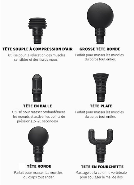 En ce qui concerne les multiples fréquences, elles vont vous permettre de ciblé les zones sujettes aux tensions de différente manière. Au-delà de ça, vous aurez à votre disposition des embouts qui vous serviront à masser diverses régions du corps comme la grosse boule pour les pectoraux ou la tête en forme de fourchette pour la colonne vertébrale.